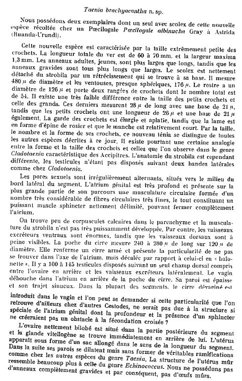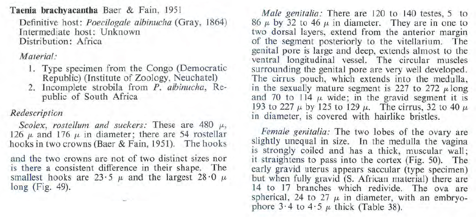Baer, J. G. and A. Fain. 1951. Cestodes nouveaux du Congo Belge. Acta Tropica 8: 59-63. (4818) Download PDFKornyushin, V. V. and L. D. Sharpilo. 1986. [A new taeniid genus (Cestoda, Taeniidae) - parasites of mustelids] (in Russian) Novyj rod teniid (Cestoda, Taeniidae) - parasitov kunih. Vestnik Zoologii 1986: 10-16. (5728) Download PDF |