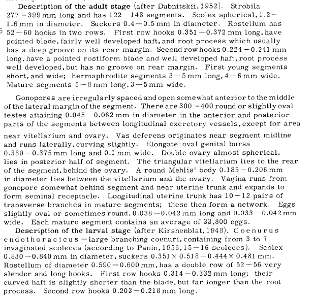 | Host Notes | Metacestode is a multiplying cysticercus in thoracic and abdominal cavities of Meriones, Gerbillus and Rhombomys. Definitive hosts Vulpes spp. (Loos-Frank 2000). |