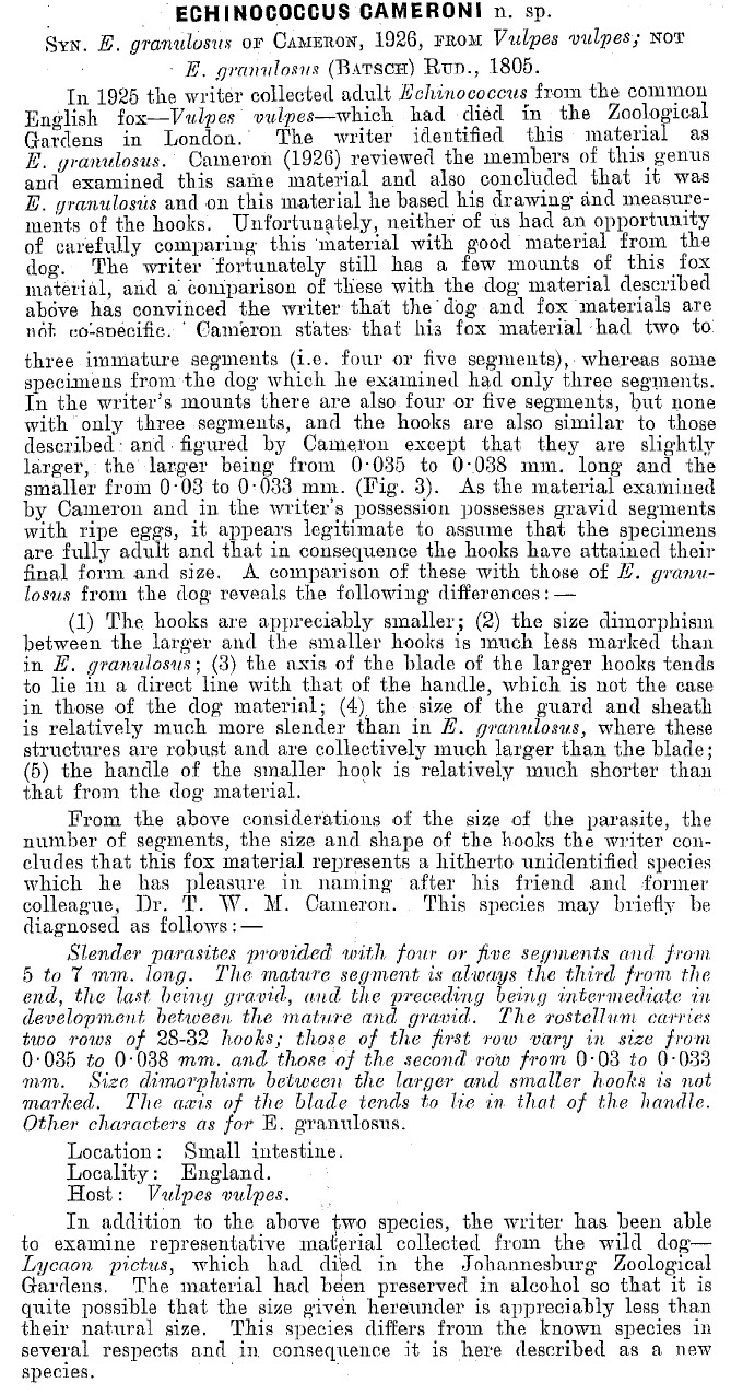 Cameron, T. W. M. 1926. Observations of the genus Echinococcus Rudolphi, 1801. Journal of Helminthology 4: 13-22. (5789) Download PDFOrtlepp, R. J. 1934. Echinococcus in dogs fromn Pretoria and vicinity. Ondersterpoort Journal of Veterinary Science and Animal Industry 3: 97-108. (6019) Download PDF |