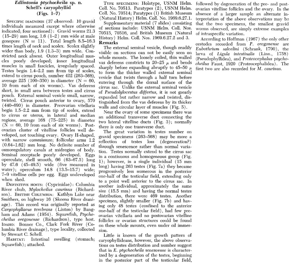 Mackiewicz J. S. 1970. Edlintonia ptychocheila gen. n., sp. n. (Cestoidea: Capingentidae) and other caryophyllid tapeworms from cyprinid fishes of North America. . Proceedings of the Helminthological Society of Washington 37: 110-118. (650) Download PDF |