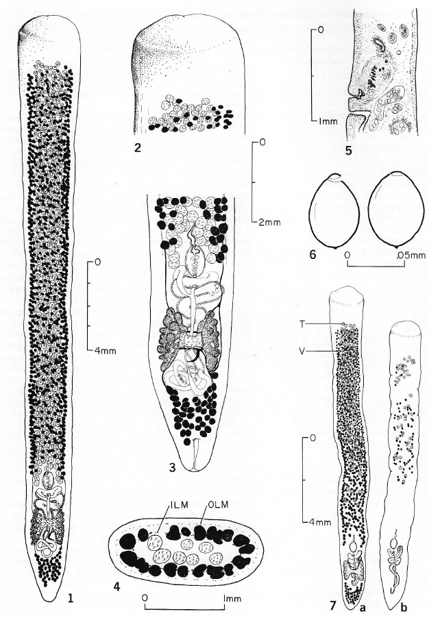 Figures 1-7. Edlintonia ptychocheila gen. n., sp. n., Schell's caryophyllid. 1. Holotype. 2. Scolex. 3. Posterior end. 4. X-section through center of body. 5. Midsagittal section through gonopores. 6. Outlines of eggs. 7a, b. Gravid specimens exhibiting abnormal testes (a, b) and vitellaria distibution (b). Abbreviations: ILM, inner longitudinal muscles: OLM, outer longitudinal muscles; T, testis; V, vitellarium.
