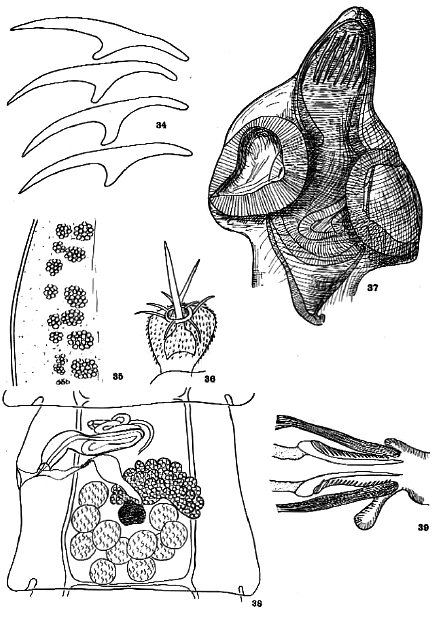 Fig. 34-39. Acanthocirrus retirostris (Krabbe): 34. Rostellar hooks. 35. Portion of a transverse section showing the powerful longitudinal muscle bundles. 36. Extremity of an evaginated cirrus with the two large spines. 37. Scolex with retracted rostellum. 38. Anatomy of an adult segment. 39. Longitudinal section of an invaginated cirrus shwoing position of the spines.