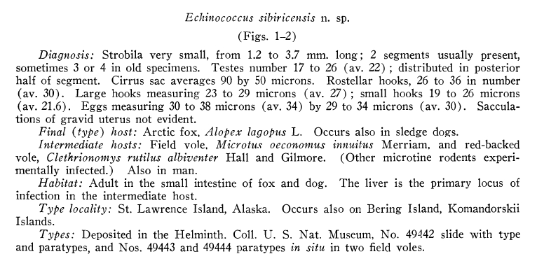 | Type Material | Types: Deposited in the Helminth. Coll. U. S. Nat. Museum, No. 49442 slide with type and paratypes, and Nos. 49443 and 49444 paratypes in situ in two field voles. |