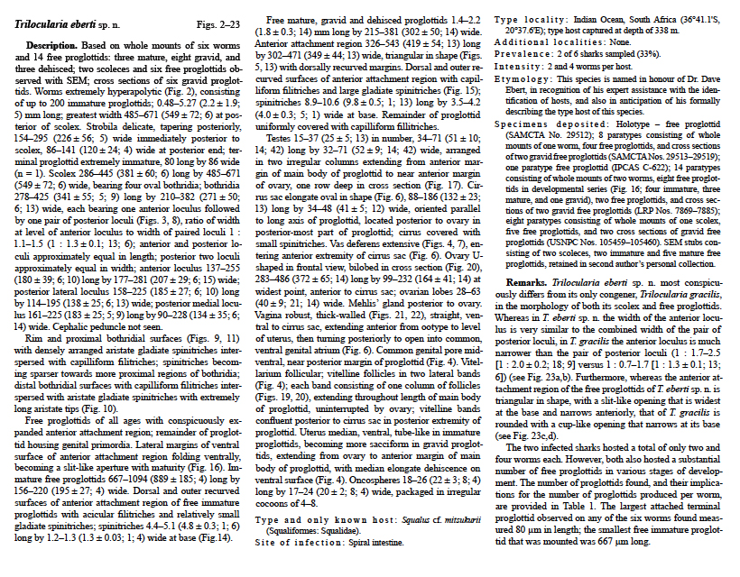 Pickering, M. and J. N. Caira. 2012. A new hyperapolytic species, Trilocularia eberti sp. n. (Cestoda: Tetraphyllidea), from Squalus cf. mitsukurii (Squaliformes: Squalidae) off South Africa with comments on its development and fecundity. Folia Parasitologica 59(2): 107-114. (5839) Download PDF |