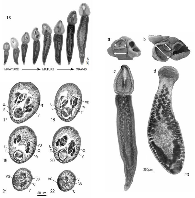 Fig. 16. Light micrographs of free proglottids of Trilocularia eberti sp. n. representing the spectrum of developmental stages found. Figs. 17–22. Histological sections of Trilocularia eberti sp. n. Fig. 17. Cross-section through testes. Fig. 18. Cross-section through testes and extensive vas deferens. Fig. 19. Cross-section through ovary arms (bilobed) and extensive vas deferens. Fig. 20. Cross-section through ovary. Fig. 21. Cross-section through cirrus sac and vagina. Fig. 22. Cross-section through cirrus sac and vagina close to genital pore opening. Abbreviations: C – cirrus; CS – cirrus sac; E – eggs; O – ovary; T – testes; U – uterus; V – vitelline follicle; VD – vas deferens; VG – vagina. Fig. 23 a–d. Trilocularia eberti sp. n. scolex (a) and free proglottid (c). Trilocularia gracilis scolex (b) and free proglottid (d) for comparison . White arrows on scoleces (a, b) illustrate difference in ration of anterior loculus to posterior loculi between the two species. a, b – scanning electron micrographs (scoleces);