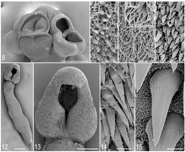 Figs. 8–15. Scanning electron micrographs of Trilocularia eberti sp. n. Note: small numbers in Figs. 8 and 13 correpsond to Figs. 9-11 and 15. Fig. 8. Scolex. Fig. 9. Detail of proximal surface of anterior loculus. Fig. 10. Detail of distal surface of medial posterior loculus. Inset: Enlarged view showing long aristate tips on gladiate spinitriches. Fig. 11. Detail of proximal surface of medial posterior loculus. Fig. 12. Mature free proglottid. Fig. 13. Detail of anterior attachment region of mature free proglottid. Fig. 14. Detail of outer surface of anterior attachment region of immature free proglottid. Fig. 15. Detail of outer surface of anterior attachment region of mature free proglottid. Scale bars: Figs. 8, 12 = 200 µm; Figs. 9-11, 14, 15 = 2 µm; Inset of Fig. 10 = 1 µm; Fig. 13 = 100 µm.
