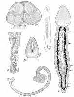 Figs. 2–7. Line drawings of Trilocularia eberti sp. n. Fig. 2. Whole worm. Fig. 3. Scolex. Fig. 4. Dehisced free proglottid, ventral view. Arrowheads indicate location of cross-sections shown in Figs. 17–22. Fig. 5. Anterior attachment region of free proglottid, dorsal view. Fig. 6. Detail of posterior portion of mature proglottid: cirrus sac and vagina, dorsal view. Fig. 7. Sketch of male reproductive system in free proglottid, dorsal view.