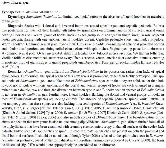 Marques, F. P. L., K. Jensen, and J. N. Caira. 2012. Ahamulina n. gen. (Cestoda: Diphyllidea) from the polkadot catshark, Scyliorhinus besnardi (Carcharhiniformes: Scyliorhinidae), off Brazil. Zootaxa 3352: 51-59.