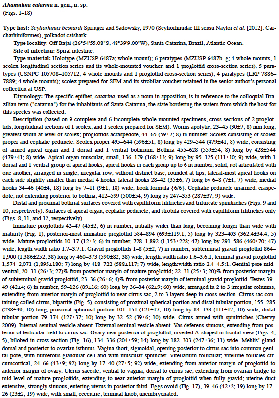 2. Scolex of holotype (MZUSP 6487a). 3. Detail of apical hooks of holotype (MZU... MoreFIGURES 15. Line drawings of Ahamulina catarina n. gen., n. sp. from Scyliorhinus besnardi. 1. Holotype (MZUSP 6487a).