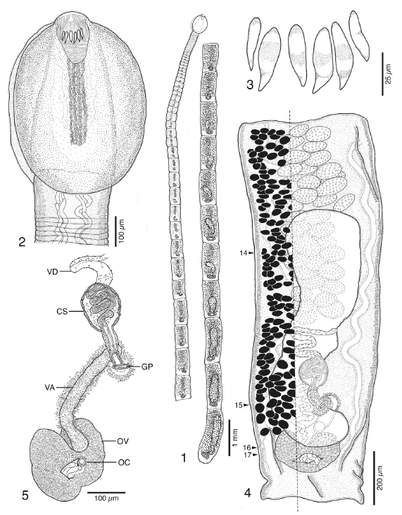 2. Scolex of holotype (MZUSP 6487a). 3. Detail of apical hooks of holotype (MZUSP 6487a). 4. Gravid proglottid of paratype,