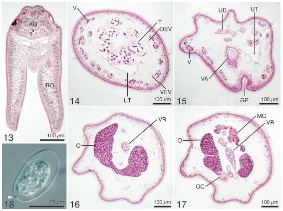 FIGURES 1318. Ahamulina catarina n. gen. n. sp. from Scyliorhinus besnardi. Figs 1317. Histological sections. 13. Sagittal