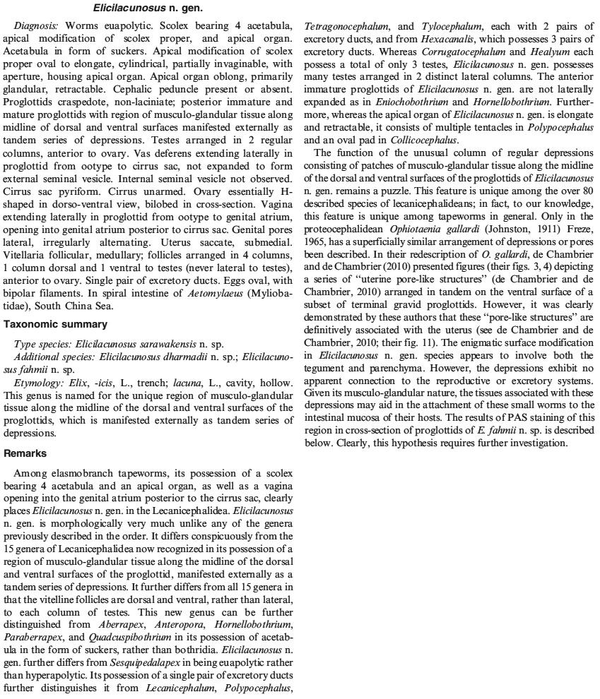 | Type Species | Elicilacunosus sarawakensis Koch, Jensen & Caira, 2012 |