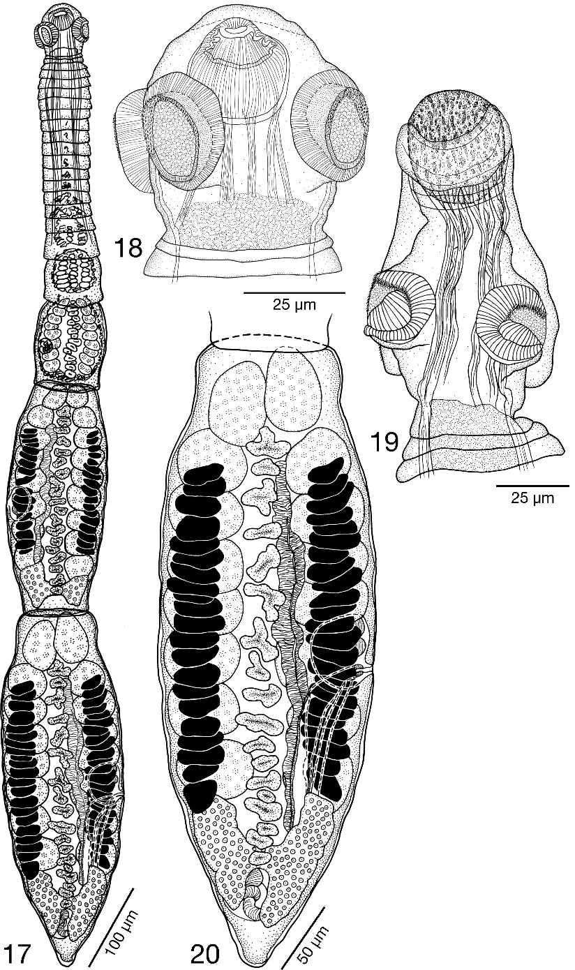 FIGURES 17–20. Line drawings of Elicilacunosus sarawakensis n. gen., n. sp. (17) Whole worm. (18) Scolex with retracted apical organ. (19) Scolex with protruded apical organ. (20) Mature terminal proglottid.