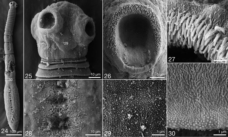 FIGURES 24–30. Scanning electron micrographs of Elicilacunosus sarawakensis n. gen., n. sp. (24) Whole worm. Small number indicates location of detail in Figure 30. (25) Scolex. Small number indicates location of detail in Figure 29. (26) Enlarged view of acetabulum. (27) Acetabular rim with coniform spinitriches and capilliform filitriches; spinitriches absent from posterior margin of rim. (28) Enlarged view of exterior representation of glandular structures. (29) Scolex proper with papilliform filitriches. (30) Proglottid with small scolopate spinitriches, becoming shorter and more conical toward posterior margins of proglottid.