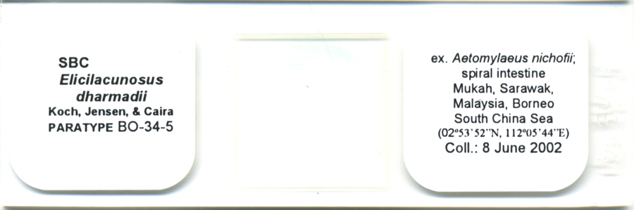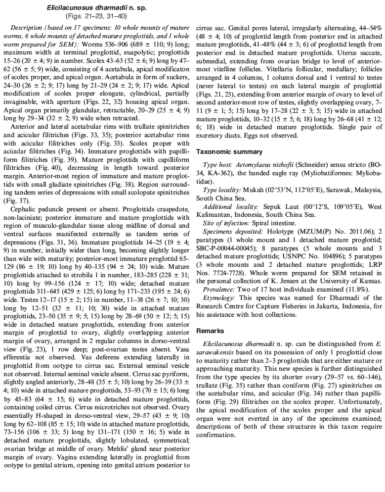 | Type Material | Holotype (MZUM(P) No. 2011.06); 2 paratypes (1 whole mount and 1 detached mature proglottid; SBC-P-00044-00045); 8 paratypes (5 whole mounts and 3 detached mature proglottids; USNPC No. 104896); 5 paratypes (3 whole mounts and 2 detached mature proglottids; LRP Nos. 7724-7728). Whole worm prepared for SEM retained in the personal collection of K. Jensen at the University of Kansas. |