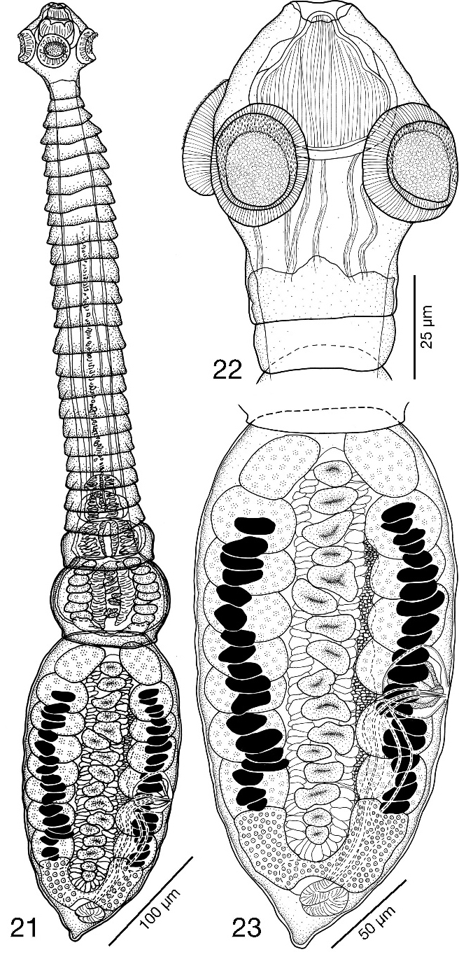 FIGURES 21–23. Line drawings of Elicilacunosus dharmadii n. gen., n. sp. (21) Whole worm. (22) Scolex. (23) Mature terminal proglottid.