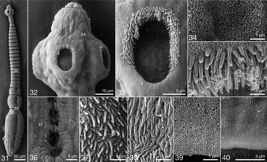 FIGURES 31–40. Scanning electron micrographs of Elicilacunosus dharmadii n. gen., n. sp. (31) Whole worm. Small numbers indicate location of detail in Figures 38–40. (32) Scolex. Small number indicates location of details in Figure 34. (33) Enlarged view of acetabulum. (34) Scolex proper with acicular filitriches. (35) Acetabular rim with trullate spinitriches and acicular filitriches; spinitriches absent from posterior margin of rim. (36) Enlarged view of external representation of glandular structures. Small number indicates location of detail in Figure 37. (37) Region surrounding external representation of glandular structures with small scolopate spinitriches. (38) Anterior region of terminal proglottid with small gladiate spinitriches. (39) Posterior