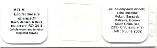 | Total Number of Type Specimens | 17 specimens: 10 whole mounts of mature worms, 6 whole mounts of detached mature proglottids, and 1 whole worm prepared for SEM |