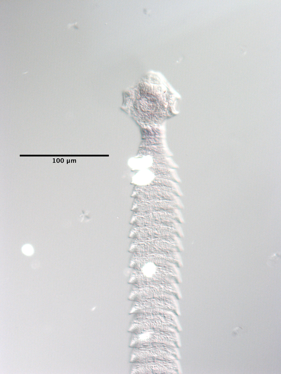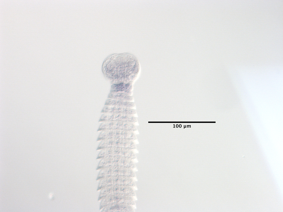 margin of anterior proglottid with papilliform filitriches, decreasing in length toward posterior margin. (40) Posterior margin of subterminal proglottid with capilliform filitriches, decreasing in length toward posterior margin.