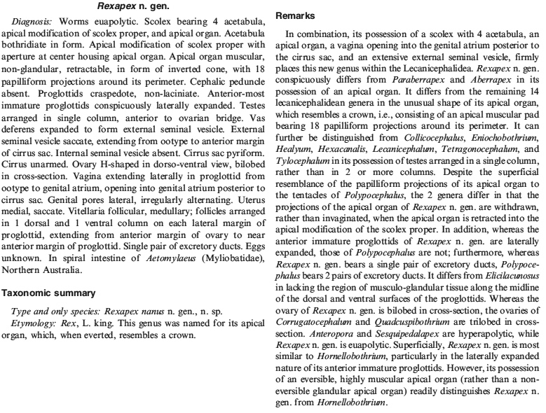 Type Species Rexapex nanus Koch, Jensen & Caira, 2012