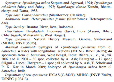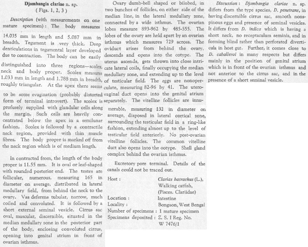 Kundu, D. K., S. B. Bhattacharya and I. B. Datta. 1985. Djombangia clariae n. sp. (Cestoidea: Caryophyllidea: Lytocestidae) from a siluroid fish in West Bengal. Bull. zool. Surv. India 7(2-3): 151-154. (5856) Download PDFAsh A., T. Scholz, M. Oros, and P. K. Kar. 2011. Tapeworms (Cestoda: Caryophyllidea), parasites of Clarias batrachus (Pisces: Siluriformes) in the Indomalayan Region. Journal of Parasitology 97(3): 435-459. (5944) Download PDF |