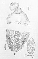 Figs. 1-3. 1. Anterior part of Djombagia clariae n. sp. showing scolex, neck and a part of body proper. 2. Posterior part of Djombagia clariae n. sp. showing details of internal organs. 3. An enlarged egg of Djombangia clariae n. sp.