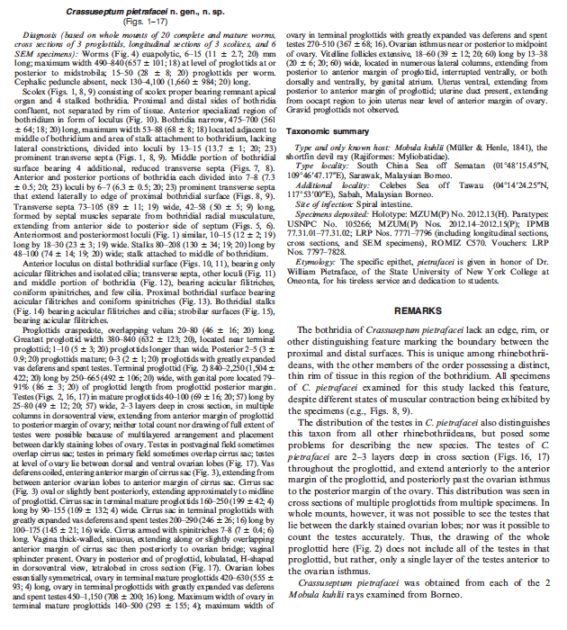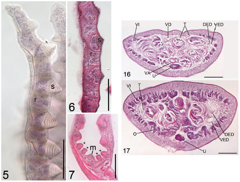 s, septal musculature. Asterisk (*) denotes 2 reduced septa on each side of middle of bothridium. Scale bars: 50 µm. FIGURES 16–17. Histological sections of proglottid of Crassuseptum pietrafacei n. gen., n. sp. (16) Cross section at level of testes. (17) Cross section at level of ovarian isthmus (LRP No. 7787). Abbreviations: DED, dorsal excretory duct; O, ovary; T, testis; U, uterus; VA, vagina; VD, vas deferens; VED,