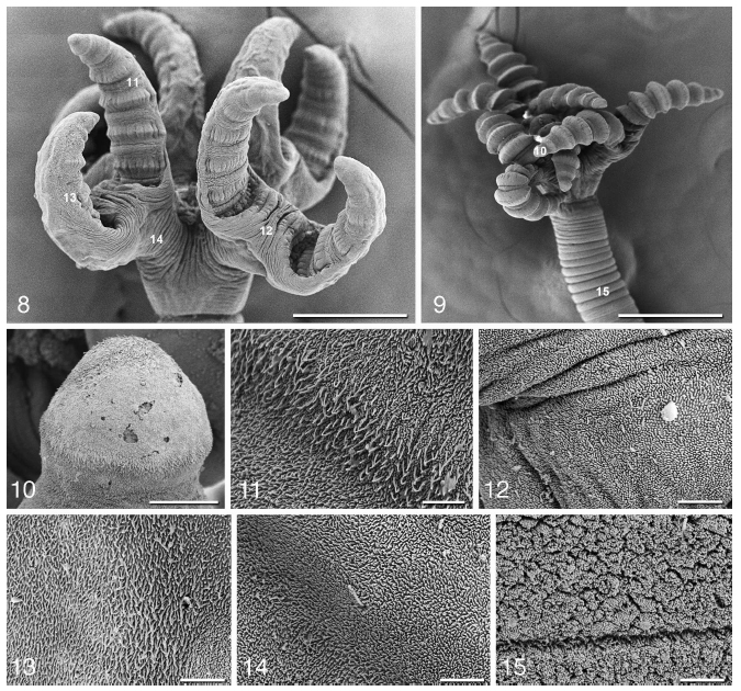 FIGURES 8–15. Scanning electron micrographs (SEMs) of Crassuseptum pietrafacei n. gen., n. sp. (8) Scolex. Small numbers indicate locations of detail shown in Figures 11–14. (9) Scolex. Small numbers ... MoreFIGURES 8–15. Scanning electron micrographs (SEMs) of Crassuseptum pietrafacei n. gen., n. sp. (8) Scolex. Small numbers indicate locations of detail shown in Figures 11–14. (9) Scolex. Small numbers indicate locations of detail shown in Figs. 10, 15. (10) Anterior loculus distal bothridial
