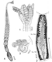 FIGURES 1–4. Line drawings of Crassuseptum pietrafacei n. gen., n. sp. (1) Scolex (Holotype). (2) Mature proglottid (Paratype); note that for clarity, only 1 of 2–3 layers of testes throughout the pro... MoreFIGURES 1–4. Line drawings of Crassuseptum pietrafacei n. gen., n. sp. (1) Scolex (Holotype). (2) Mature proglottid (Paratype); note that for clarity, only 1 of 2–3 layers of testes throughout the proglottid are drawn. Arrows indicate location of cross sections shown in Figures 16–17. Asterisk (*) indicates portion of proglottid, corresponding to ovary, in which not all testes are drawn. (3) Detail of terminal genitalia (Paratype). (4) Whole