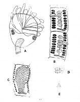 Fig. 1 Polypocephalus rakhamalii n.sp. A. Scolex; B. Mature segment; C. Gravid segmens; D. Testes; E. Eggs.