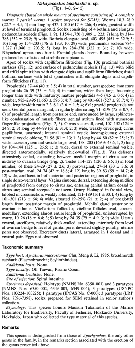 | Type Material | Holotype (NMNS No. 6350001) and 3 paratypes (NMNS Nos. 6350002, 6349003, 6349004); 3 paratypes (USNPC Nos. 103224103225); 1 paratype (IPCAS No. C-000); 3 paratypes (LRP Nos. 7396-7398), scolex prepared for SEM retained in senior authors collection. |