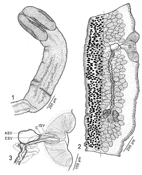 No. 6350-001). (2) Mature proglottid. (NMNS No. 6350-001). (3) Detail of terminal genitalia (NMNS No. 6350-001). Abbreviations: ASV, accessory seminal vesicle; C, cirrus; ESV, external seminal vesicle; ISV, internal seminal vesicle.