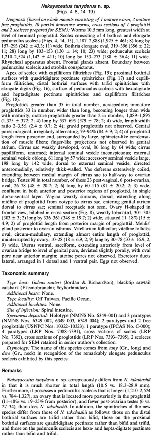 | Type Material | Holotype (NMNS No. 6349001) and 3 paratypes (NMNS Nos. 6349002, 6349003, 6349004); 2 paratypes and 2 free proglottids (USNPC Nos. 1032210323); 1 paratype (IPCAS No. C-000); 4 paratypes (LRP Nos. 73887391), cross sections of scolex (LRP No. 7392), cross sections of proglottids (LRP Nos. 73937395), 2 scoleces prepared for SEM retained in senior authors collection. |