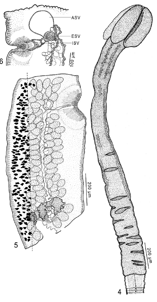 Nakayacestus tanyderus. n. sp. (4) Scolex (USNPC No. 103222). (5) Mature proglottid. (USNPC No. 103223). (6) Detail of terminal genitalia (USNPC