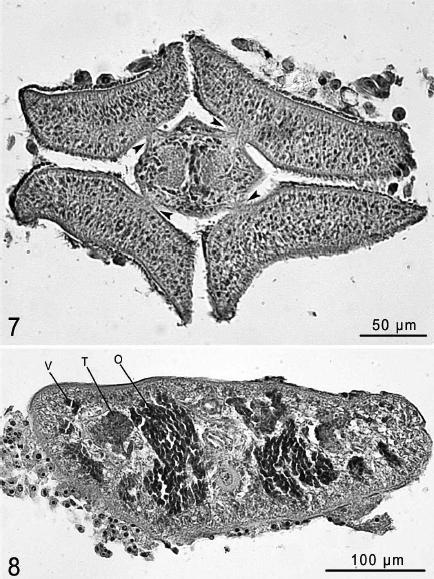 Cross section through scolex at level of bothria; arrows indicate