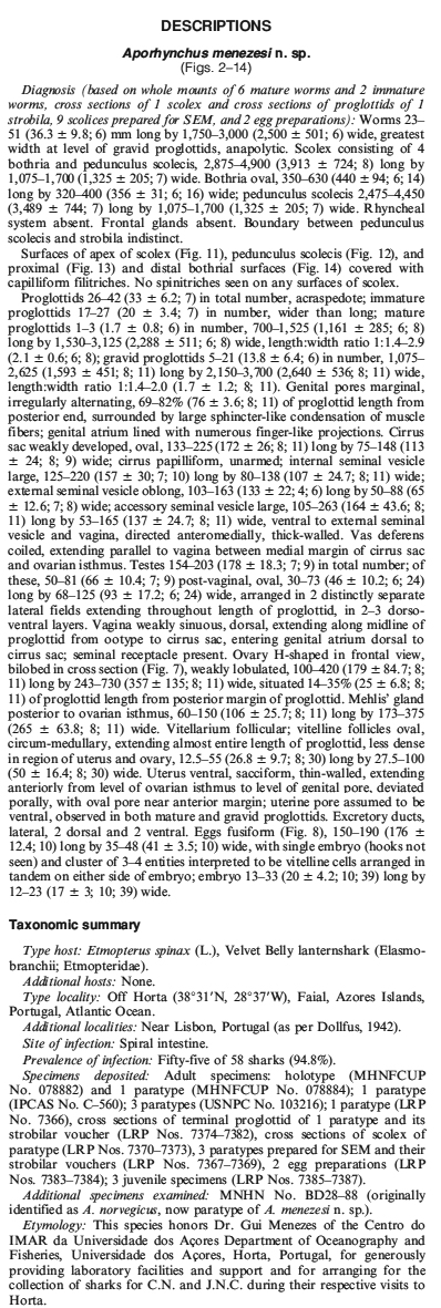 Noever, C., J. N. Caira, R. Kuchta, and L. Desjardins. 2010. Two new species of Aporhynchus (Cestoda: Trypanorhyncha) from deep water Lanternsharks (Squaliformes: Etmopteridae) in the Azores, Portugal. Journal of Parasitology 96(6): 1176-1184.