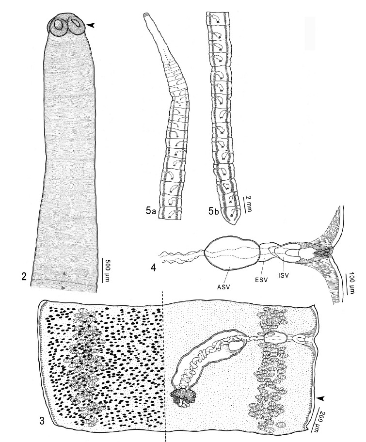 Type Material Adult specimens: holotype (MHNFCUP No. 078882) and 1 paratype (MHNFCUP No. 078884); 1 paratype (IPCAS No. C–560); 3 paratypes (USNPC No. 103216); 1 paratype (LRP No. 7366), cross sections of terminal proglottid of 1 paratype and its strobilar voucher (LRP Nos. 7374–7382), cross sections of scolex of paratype (LRP Nos. 7370–7373), 3 paratypes prepared for SEM and their strobilar vouchers (LRP Nos. 7367–7369), 2 egg preparations (LRP Nos. 7383–7384); 3 juvenile specimens (LRP Nos. 7385–7387).