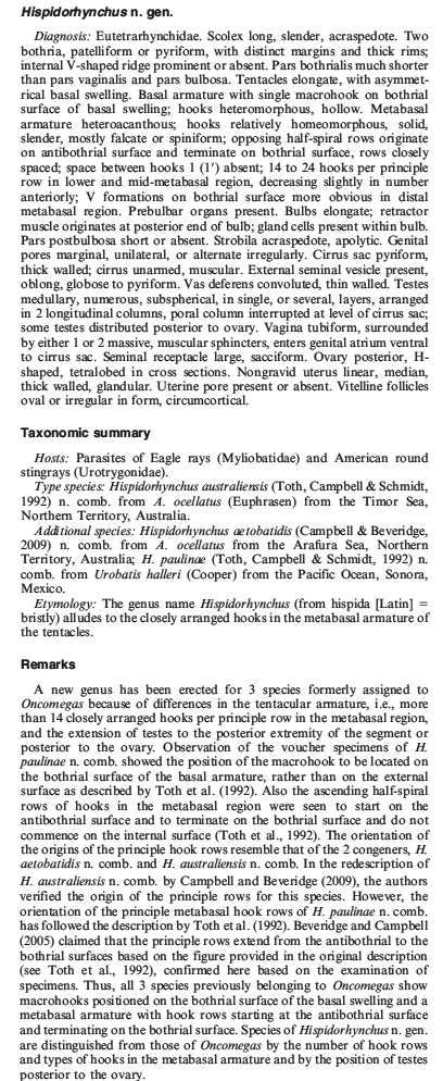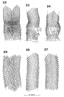 Figs. 22-27. Oncomegas paulinae n. sp., tentacular armature. 22. Basal armature and lower metabasal region of tentacle, internal face. 23. Basal region of tentacle, bothridial face, note asymmetrical ... MoreFigs. 22-27. Oncomegas paulinae n. sp., tentacular armature. 22. Basal armature and lower metabasal region of tentacle, internal face. 23. Basal region of tentacle, bothridial face, note asymmetrical swelling on internal face at left. 24. Basal region of tentacle, external face, note macrohook of basal armature. 25. Metabasal region, internal face. 26. Metabasal region, bothridial face. 27. Metabasal region, external face. |