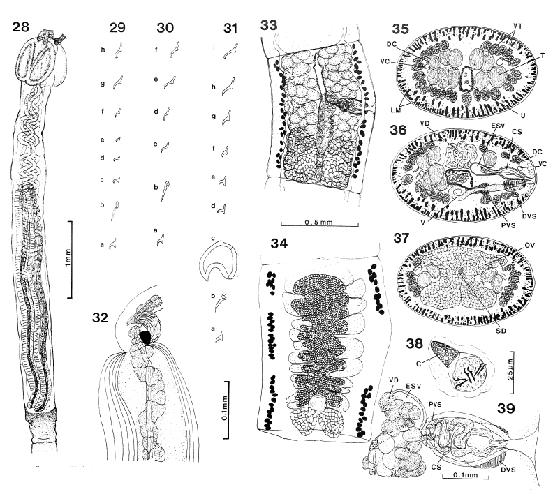 Figs. 28-32. Oncomegas paulinae n. sp. 28. Scolex. 29. Hook types from one file, proximal to distal, along internal face: (a-e) basal armature, (f-h) lower metabasal to mid-region of tentacle. 30. Hoo... MoreFigs. 28-32. Oncomegas paulinae n. sp. 28. Scolex. 29. Hook types from one file, proximal to distal, along internal face: (a-e) basal armature, (f-h) lower metabasal to mid-region of tentacle. 30. Hooks types from one file, proximal to distal, along bothridial face: (a-c) basal armature, (d-f) lower metabasal to mid-region of tentacle. 31. Hook types from one file, proximal to distal on external face: (a-e) basal armature, (f-i) lower metabasal to mid-region of tentacle. 32. Anterior portion of bulb showing prebulbar organ. Figs. 33-39. Oncomegas paulinae n. sp. 33. Mature segment. 34. Gravid segment. Figs. 35-37. Transverse sections through mature segment. 35. Proximal to cirrus-sac; note dorsal interruption of vitelline follicles. 36. Through terminal genitalia; note vaginal sphincters and position of osmoregulatory canals dorsal to cirrus-sac. 37. Section through ovary at ovarian isthmus; note lateral position of osmoregulatory ducts. 38. Embryonated egg, showing conical projection attached to oncospheral membrane. 39. Dorsal view of cirrus-sac, external seminal vesicle and distal vagina. Abbreviations: C, conical projection; CS, cirrus-sac; DC, dorsal osmoregulatory canal; DVS, distal vaginal sphincter; ESV, external seminal vesicle; LM, longitudinal muscle bundles; OV, ovary; PVS, proximal vaginal sphincter; SD, sperm duct; T, testis; U, uterus; V, vagina; VC, ventral osmoregulatory canal; VD, vas deferens; VT, vitelline follicle. |