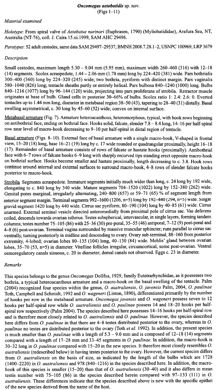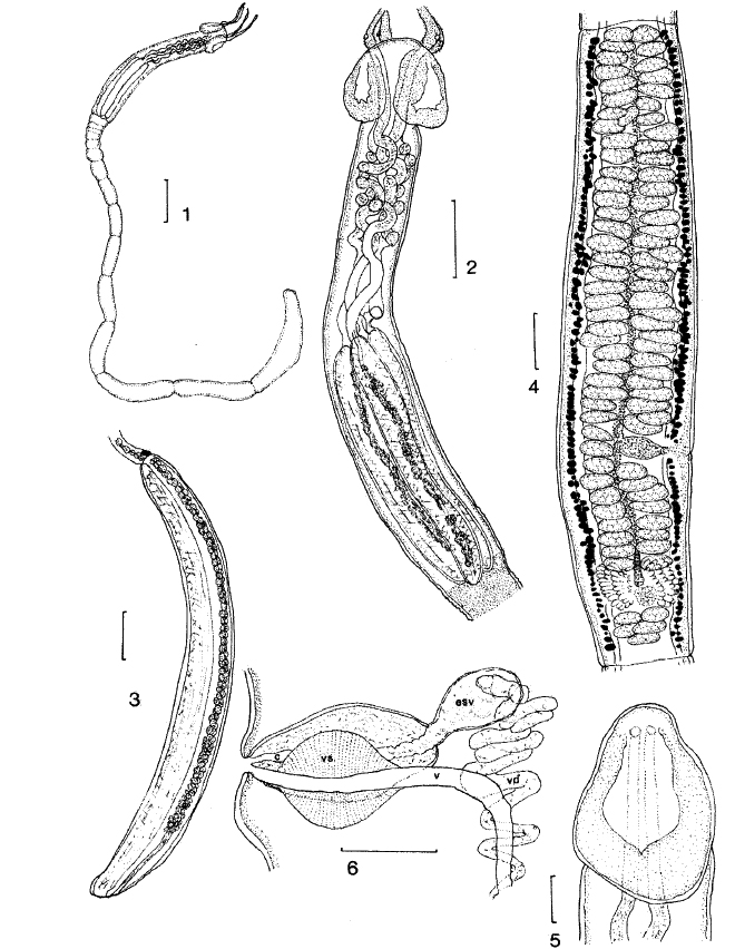 Figures 1-6. Oncomegasu aetobatidis sp. nov. from the eagle ray, Aetobatus narinari. 1. Entire cestode, 2. Scolex, 3. Bulb, 4. Mature segment, 5. Bothrium, dorsal view, 6. Terminal genitalia. Scale ba... MoreFigures 1-6. Oncomegasu aetobatidis sp. nov. from the eagle ray, Aetobatus narinari. 1. Entire cestode, 2. Scolex, 3. Bulb, 4. Mature segment, 5. Bothrium, dorsal view, 6. Terminal genitalia. Scale bars: 1, 0.5 mm; 2, 0.25 mm; 3-6. 0.1 mm. Abbreviations: c, cirrus; esv, external seminal vesicle; v. vagina; vd, vas deferens; vs. vaginal sphincter. |