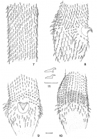 Figures 7-11. Oncomegas aetobatidis sp. nov. from the eagle ray, Aetobatus narinari. Tentacular armature. 7. Metabasal armature, bothrial surface, internal surface on left hand side. 8. Basal armature... MoreFigures 7-11. Oncomegas aetobatidis sp. nov. from the eagle ray, Aetobatus narinari. Tentacular armature. 7. Metabasal armature, bothrial surface, internal surface on left hand side. 8. Basal armature, external surface; bothrial surface on right hand side. 9. Basal armature, bothrial surface. 10. Basal armature, antibothrial surface. 11. Hooks of metaasal armature. Scale-bars: 0.01 mm; 7-10 to same scale. |