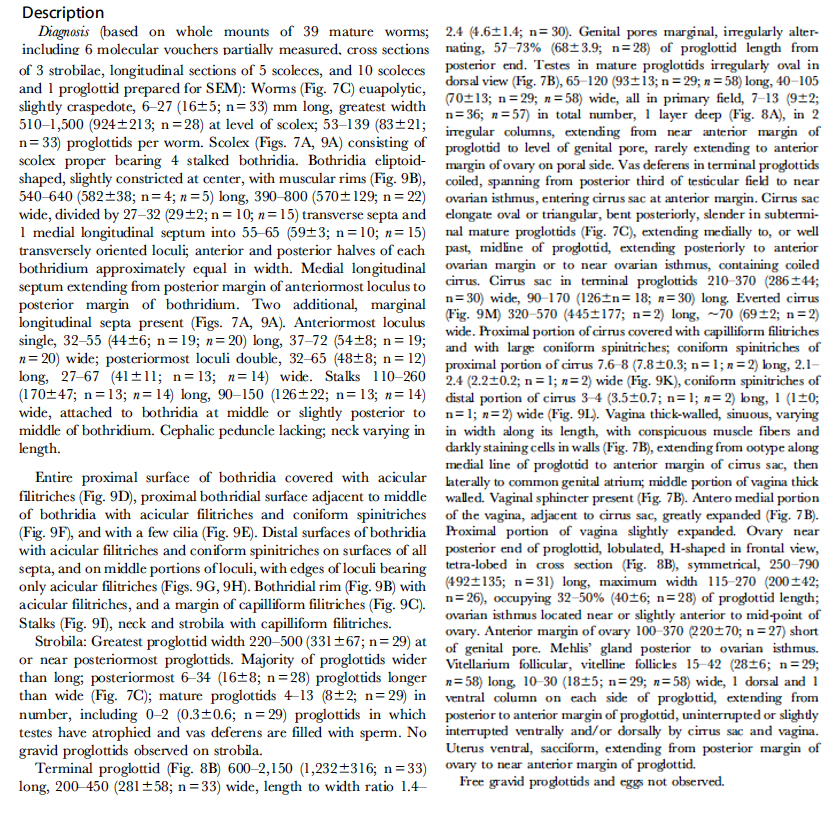 104712). Arrows indicate locations of sections shown in Fi... MoreFigure 7. Line drawings of Rhinebothrium brooksi n. sp. A. Scolex of Holotype (MZUSP 6124). B. Terminal mature proglottid of Paratype (USNPC