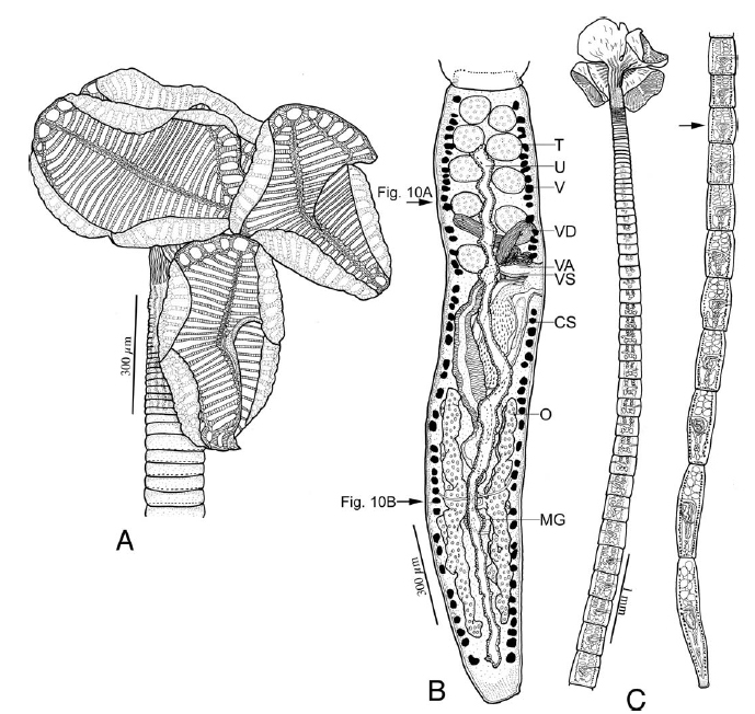 indicates anterior most mature proglottid. Abbreviations: CS, Cirrus sac; MG, Mehlis’ gland; O, Ovary; T, Testes; U, Uterus; V, Vitellaria; VA Vagina; VD,