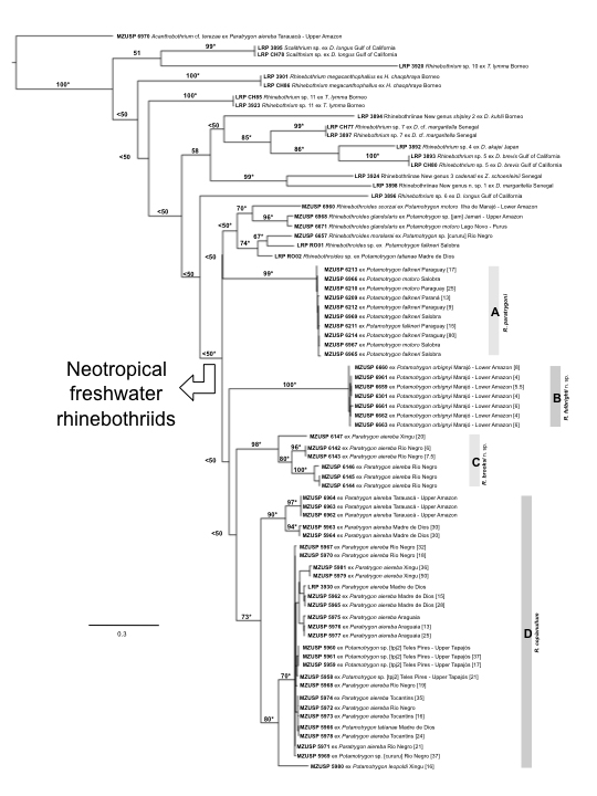 Figure. 2. Best-scoring ML tree (–lnL = 7193.942769) based on COI data from marine and freshwater rhinebothriids. Numbers on internal branches denote nodal support as inferred by Bootstrap Proportions... MoreFigure. 2. Best-scoring ML tree (–lnL = 7193.942769) based on COI data from marine and freshwater rhinebothriids. Numbers on internal branches denote nodal support as inferred by Bootstrap Proportions based on 5,000 replicates. *, indicates nodes recovered during phylogenetic analysis under parsimony. Numbers between square brackets in front of terminals represent total length in millimeters for those specimens measured. Scale indicates expected number of substitution per site. |