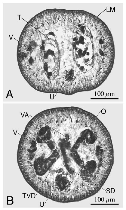 Sperm duct; T, Testes; TVD, Transverse vitelline duct; U, Uterus; V,