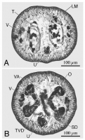 ovarian isthmus. Abbreviations: LM, Longitudinal muscles; O, O... MoreFigure 8. Cross-section through mature proglottid of Rhinebothrium