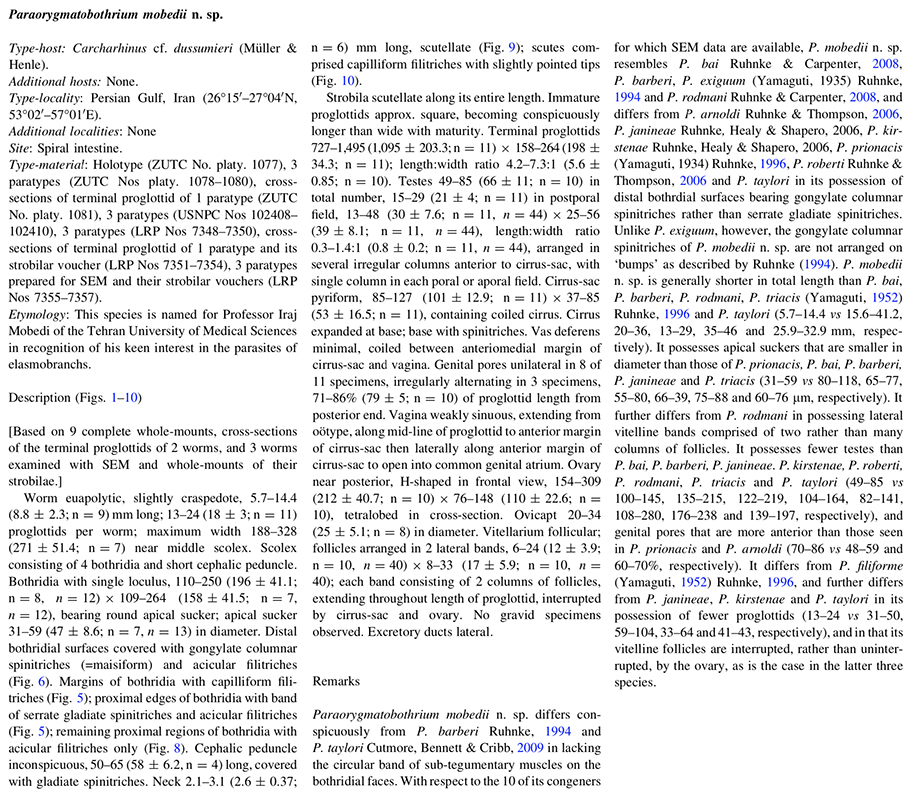 | Type Material | Holotype (ZUTC No. platy. 1077) paratypes (ZUTC Nos. platy. 1078-1080), crossections of terminal proglottid of 1 paratype (ZUTC No. platy. 1081), 3 paratypes (LRP Nos 7348-7350), cross-sections of terminal proglottid of 1 paratype and its strobilar voucher (LRP Nos 7351-7354), 3 paratypes prepared for SEM and their strobilar vouchers (LRP Nos7355-7357) |