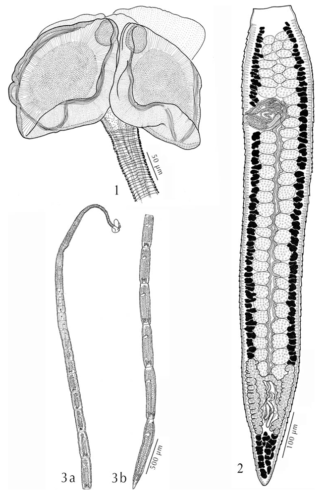 Figs. 1–3 Paraorygmatobothrium mobedii n. sp. 1. Scolex (USNPC No. 102408). 2. Terminal proglottid (ZUTC No. platy. 1077).