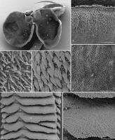 Figs. 4–10 Scanning electronmicrographs of Paraorygmatobothriummobedii n. sp. 4. Scolex; small numbers indicate locations of Figs. 6, 7 and 9. 5. Band of spinitriches on proximal surface of bothridium; small numbers indicate locations of Figs. 7 and 8. 6. Enlarged view of distal bothridial surface. 7. Enlarged view of band of spinitriches on edge of proximal bothridial surface. 8. Enlarged view of capilliformfilitriches on remaining proximal bothridial surfaces. 9. Scutes on neck; small number indicates location of Fig. 10. 10. Enlarged view of capilliform filitriches comprising neck scutes. Scale-bars: 4, 100 µm; 5, 10 µm; 6–8, 10, 2 µm; 9, 10 µm