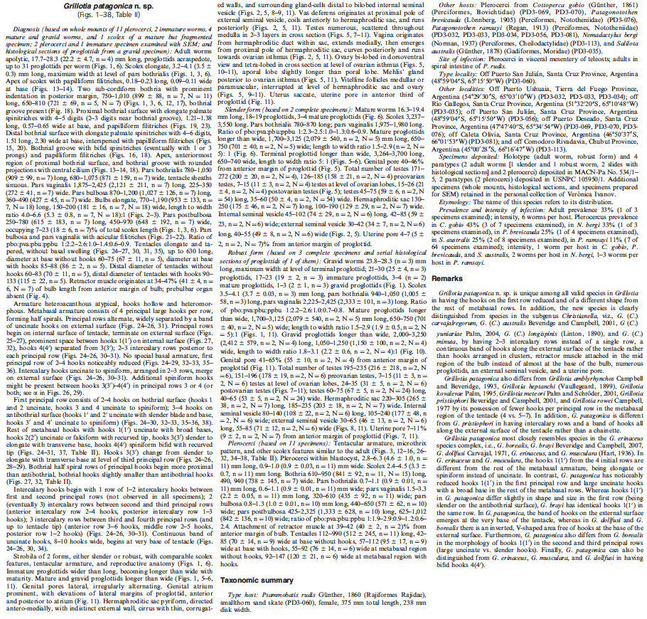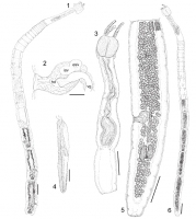FIGURES 1–6. Grillotia patagonica n. sp. (1) Entire worm (robust form) ex Psammobatis rudis, scale bar = 1 mm. (2) Detail of terminal genitalia (slender form) ex P. rudis, scale bar=100 µm. (3) Pleroc... MoreFIGURES 1–6. Grillotia patagonica n. sp. (1) Entire worm (robust form) ex Psammobatis rudis, scale bar = 1 mm. (2) Detail of terminal genitalia (slender form) ex P. rudis, scale bar=100 µm. (3) Plerocercus ex Salilota australis, scale bar=1 mm. (4) Detail of the bulb from immature specimen ex P. rudis, scale bar=200 µm. (5) Terminal mature proglottid (slender form), dorsal view, scale bar=500 µm. (6) Entire worm (slender form) ex P. rudis, scale